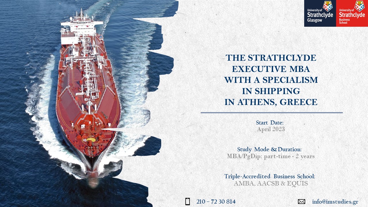 The Strathclyde Executive MBA with a specialism in Shipping is a collaboration between Strathclyde’s Business faculty and its department of Naval Architecture, Ocean and Marine Engineering (NAOME). It is being promoted and delivered in Athens, Greece by International Management Studies. International Management Studies (IMS) is the University’s Greek branch. IMS College  provides local administrative services as well as seminars and examinations. SBS provides core teaching materials and sends Strathclyde University faculty members to Greece to run intensive seminars.